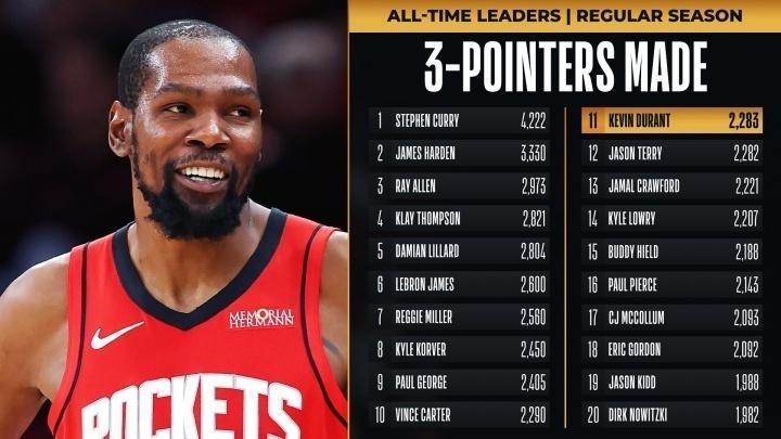 全场杜兰特24中11,三分9中4,拿下33分8板2助1盖帽,凭借这样的表现,杜兰特生涯三分命中总数提升至2290个,成功追平卡特并列NBA历史第十。